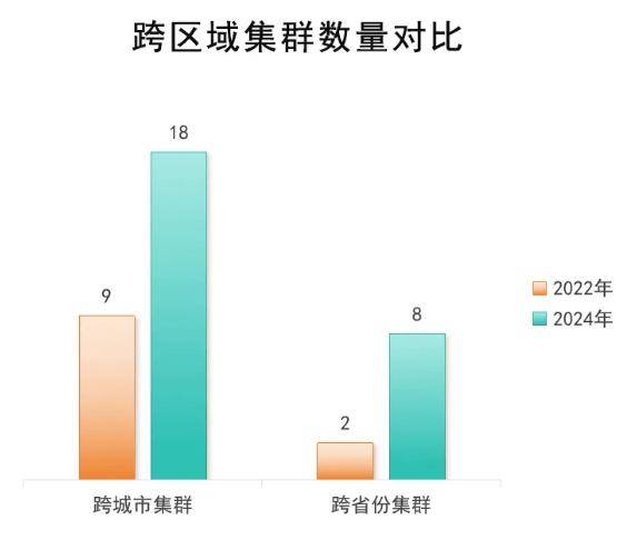 2022年公布的45个集群中,有9个为跨城市联合申报,2个为跨省份联合申报,跨区域集群占比约24%。而2024年的35个集群中,有18个为跨城市联合申报,8个为跨省份联合申报,跨区域集群占比高达74%。目前,全国已有37个跨区域集群,包括27个跨城市集群和10个跨省份集群,占集群总数的46%。